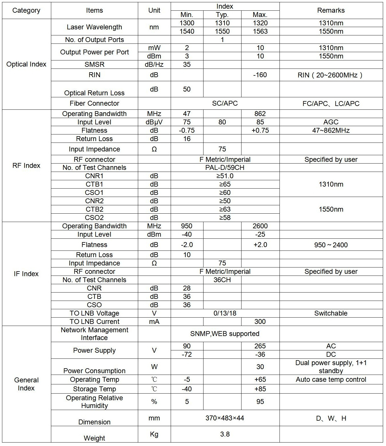 4.Adopts high linear RF/IF driving amplifying circuit with AGC function to ensure high-quality transmission of analog TV, digital TV (DBS-C,DBS-T) and satellite TV signals in a single fiber.